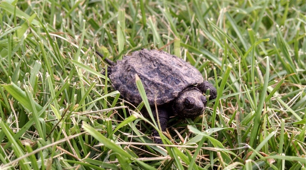 After that I cross the ditch that separates Winfield Village from the subdivisions south of us, and run in the Lake Park forest. Today, just after crossing the weir, I saw this little snapping turtle: