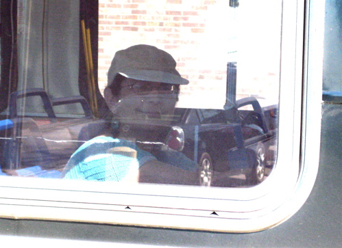 Jackie’s bus left three minutes before mine, so I had a chance to take this photo. I did some pretty heavy processing in iPhoto, mostly adjusting the levels so as to emphasize Jackie’s face at the cost of washing out things like the brick wall behind the bus. I’m rather pleased with the way it came out.