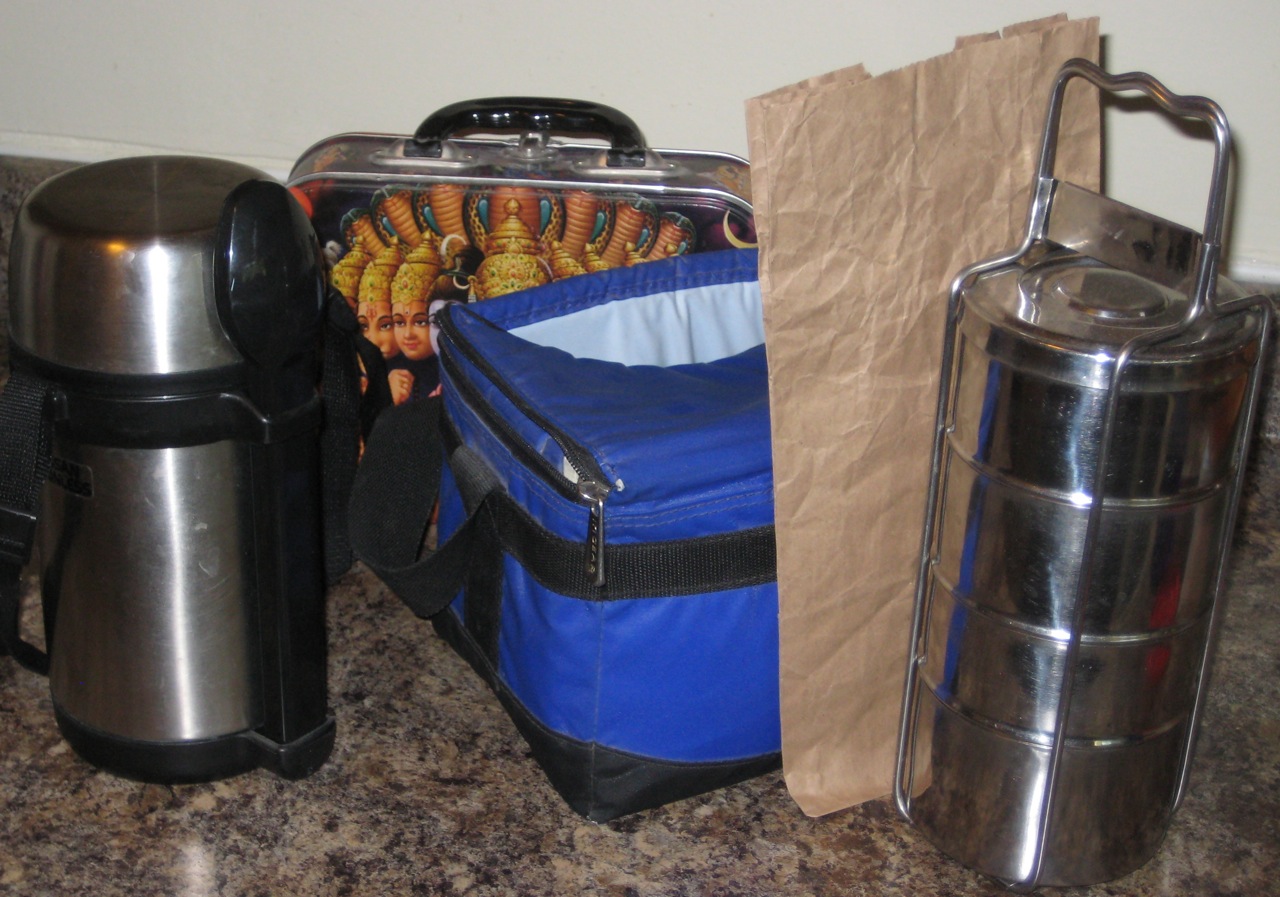 Next to that is a brown paper bag, which I contend is a perfectly reasonable choice for brown-bag lunches: paper is cheap, made from renewable resources without requiring large amounts of energy, and is bio-degradable.