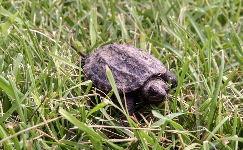 After that I cross the ditch that separates Winfield Village from the subdivisions south of us, and run in the Lake Park forest. Today, just after crossing the weir, I saw this little snapping turtle: