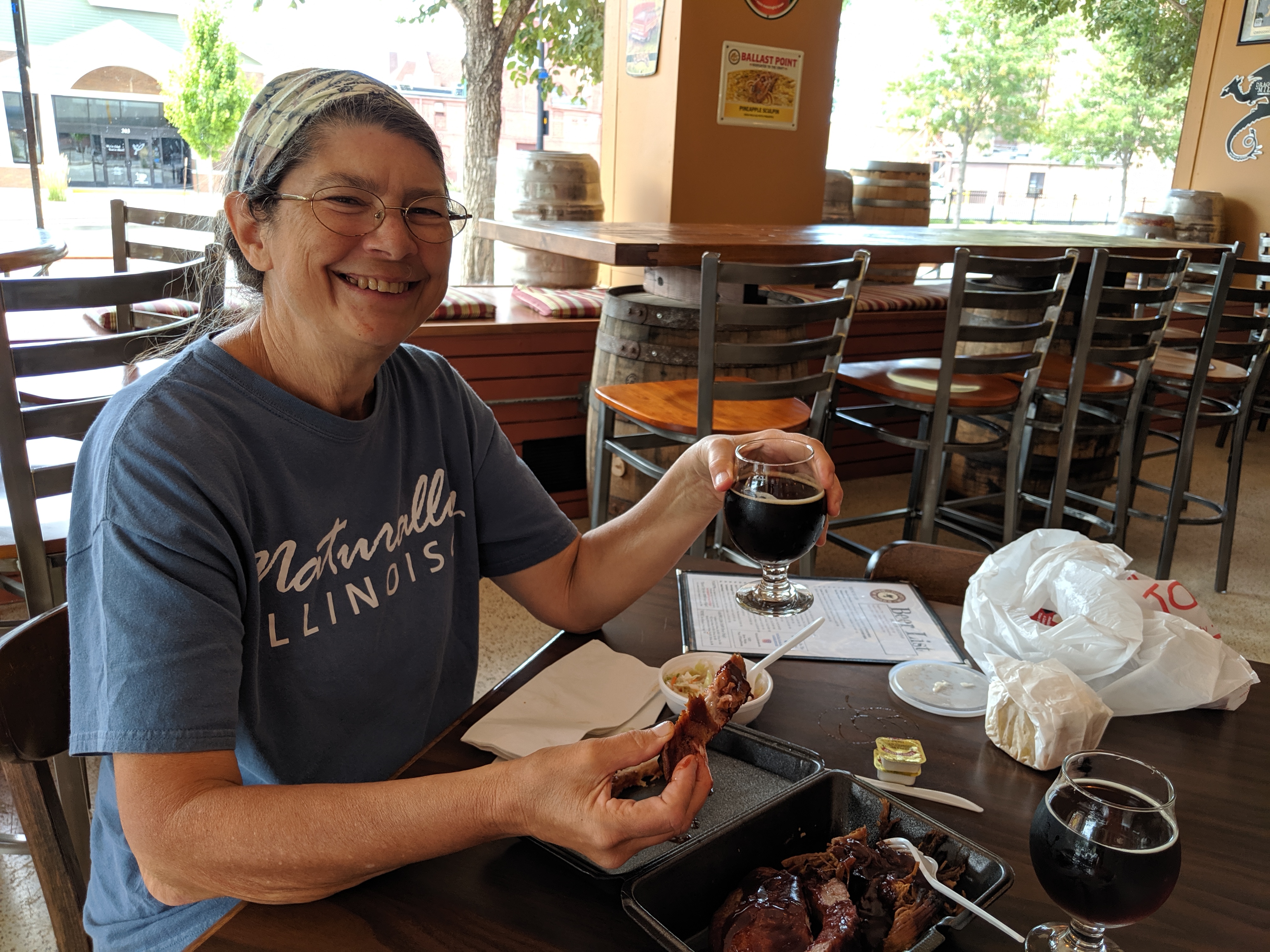 After hiking at Spitler woods, stopping for beers at @decaturbreworks. They don’t have their IPAs! I’ve got a scotch ale that’s pretty good and @jackieLbrewer has an imperial stout. Food from local BBQ place.