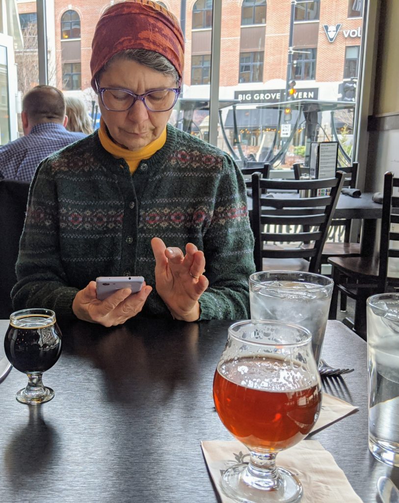 Very seriously dealing with some spam email, @jackieLbrewer is enjoying a Destihl Dosvidanya Rye Barrel, while I’m drinking a nicely bitter rye pale ale.
