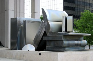 Even though we were tired, after all that sitting, Jackie and I needed to do some walking, so we strolled a bit. Just two blocks up is the public library in a huge, modern building--Champaign needs a library building like this. Outside is a wonderful sculpture titled "Volumes" by Jim Collins. I think it's the perfect sculpture for a library.