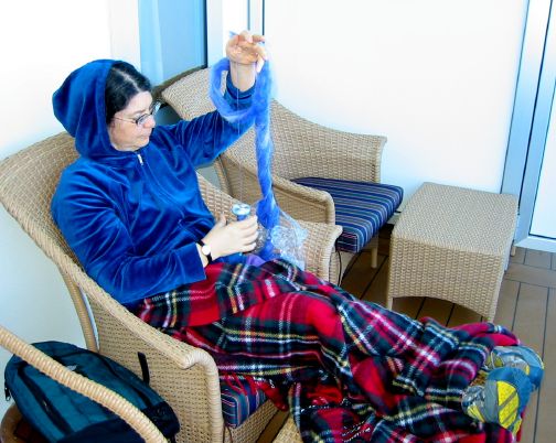 This is Jackie spinning on our veranda during the cruise. More than one person who didn't get to meet Jackie at TorCon heard about her sitting in the hallway outside the Strange Horizon's party spinning yarn. In this picture she has a chair and she's probably spinning a different color of yarn, but it's otherwise pretty much the same.