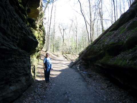 Jackie and I had lunch at the Inn, then hiked on several of the trails, making a point of hitting most of the more rugged ones. The term "rugged" gets thrown around quite a bit on state park trail descriptions--some parks seem to use it for any trail that isn't wheelchair accessible--but Turkey Run's rugged trails are legitimately rugged. They're very pretty as well.
