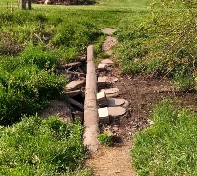 This weir crosses a ditch that runs behind Winfield Village. It’s concrete, a good 12 inches wide, but curved on top, making it a pretty good imitation of a log put across a river to serve as a bridge. I’ve been including it as part of my running route, initially with some difficulty (needing to use the concrete blocks as additional stepping stones), but now crossing on just the weir, and beginning to pick up the pace.