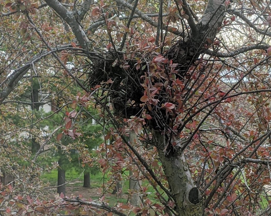 A pair of mourning doves built a nest in this former squirrel nest just outside my study window. I just saw a crow visit the nest and fly off with an egg in its beak. Sometimes the circle of life is pretty small.