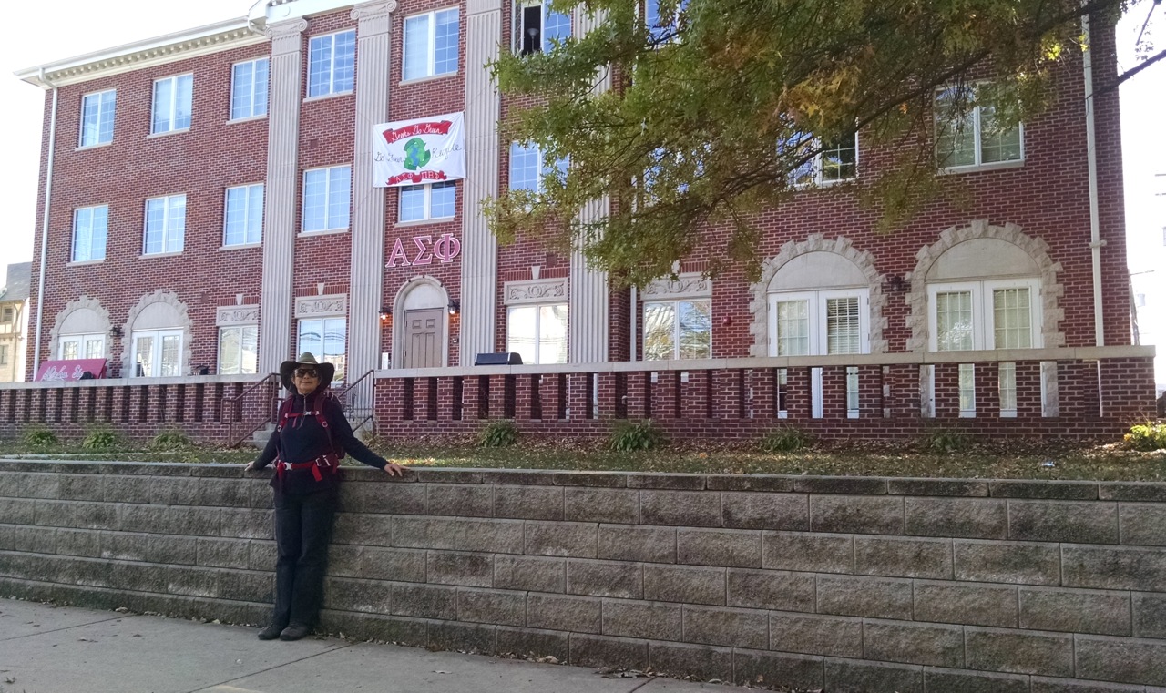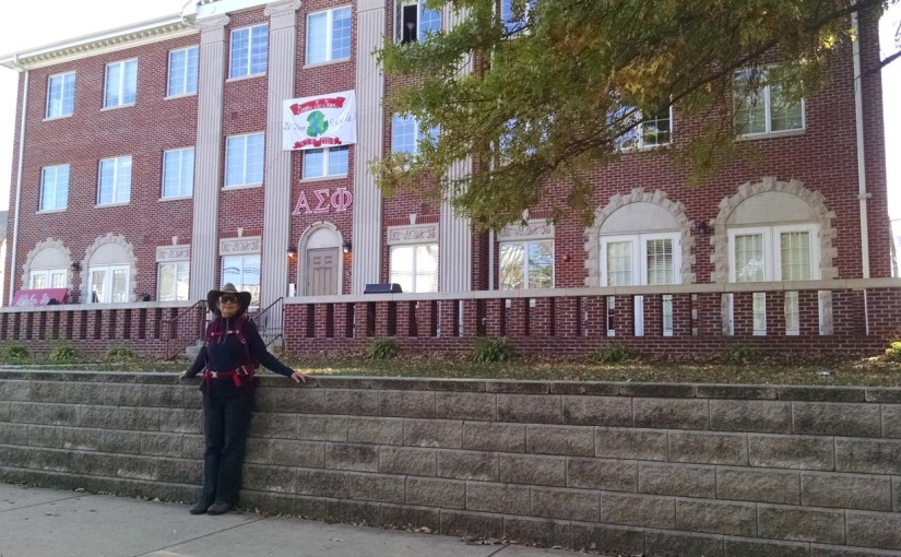 I didn’t take many pictures, but I did get this one of Jackie in front of the Alpha Sig frat house, Chuck McCaffrey’s old fraternity. This would have been along about mile 10 of our walk.