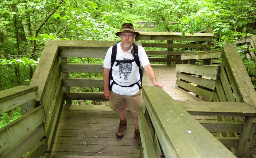 Today we hiked at Allerton Park, doing a bit over 6 miles of some not-too-rugged trails. We’d had it in our heads to do 6 more miles on the other side of the Sangamon River, but decided to skip it due to schedule constraints—we would have had to rush to get home in time to got to my Esperanto meeting and the farmers market this evening.