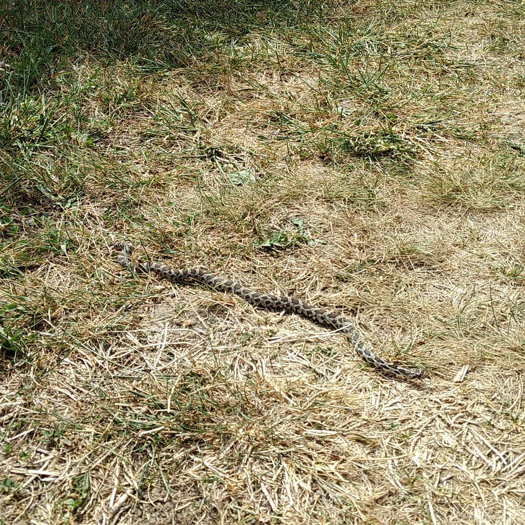 This handsome fellow was hanging out right outside our front window, vibrating the tip of his tail as if he had a rattle. East-Central Illinois.