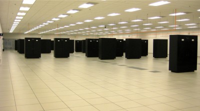 This picture shows just the power stations—all the space between these units will, over the next few months, be filled with rack after rack of water-cooled POWER7 modules. (A big part of the building houses cooling towers to dissipate that heat).